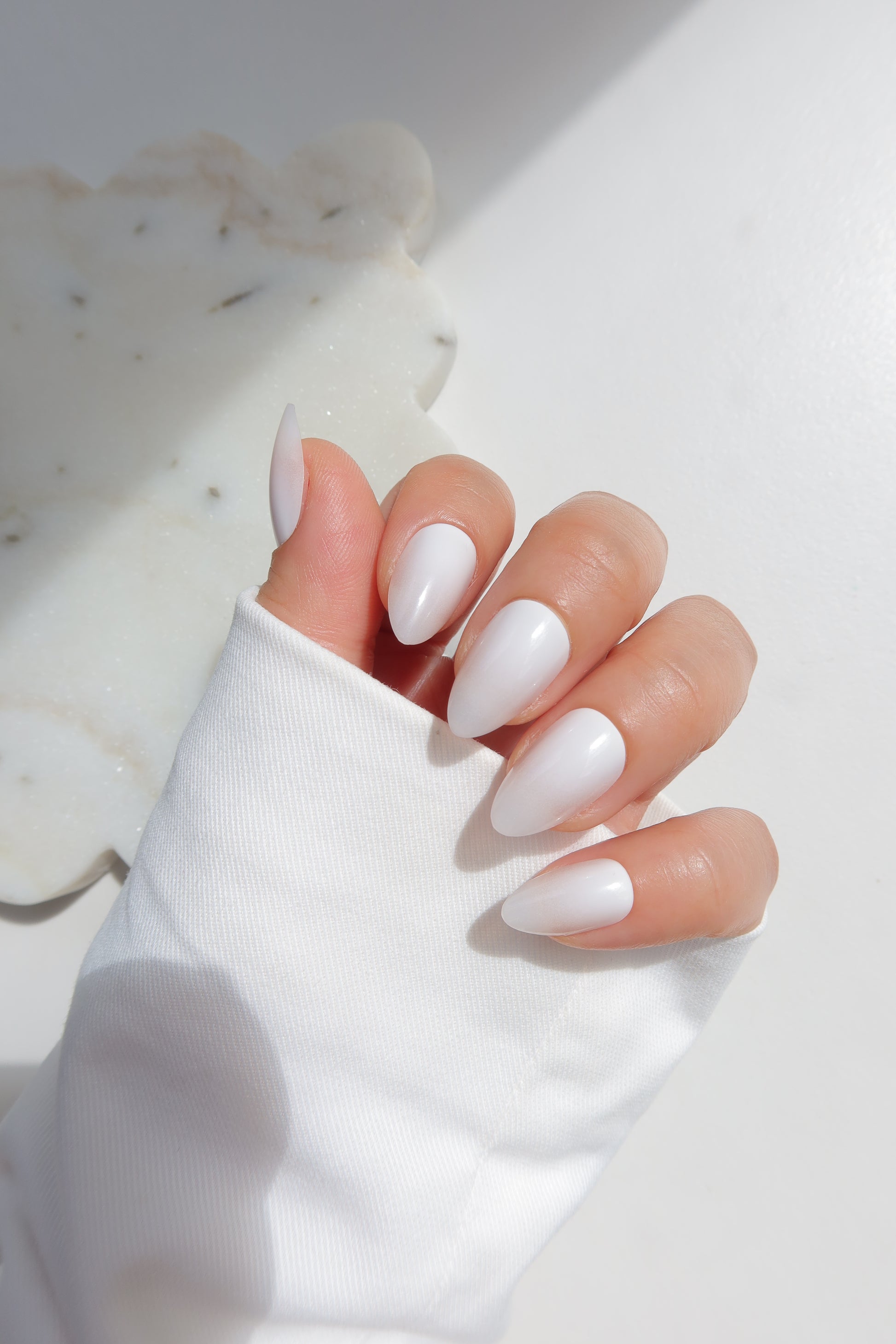 A crisp alpine white base that fades seamlessly into a translucent ombré tip, creating the perfect balance of clean elegance and modern minimalism.